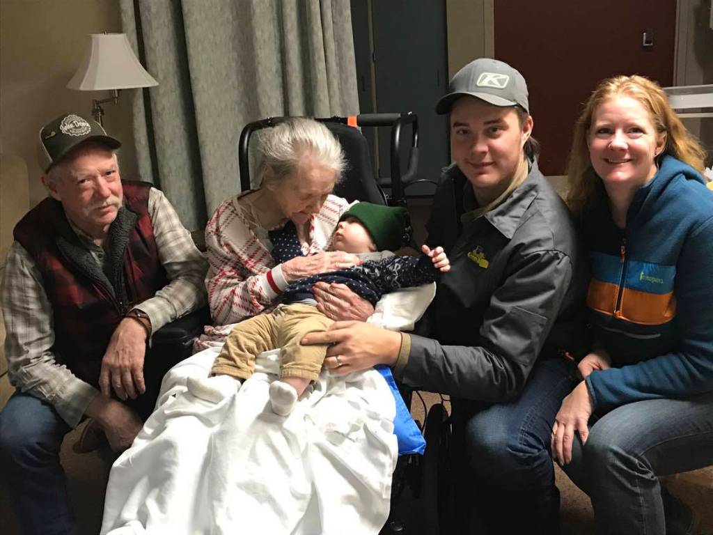 In the early 2020s, the extended Keeler clan continues on the southern Kenai Peninsula, with (far right) Vikki, the daughter of Ina (Keeler) and Spek Jones, her son Brad and his infant son Hugh. At left is Spek Jones and his mother Nelda Jones. Photo courtesy of the Keeler Family Collection.