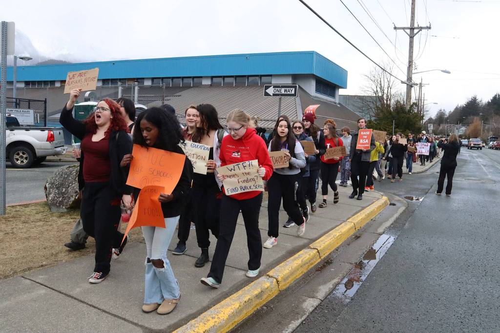 Scores of Juneau students participated in a statewide walkout of schools Thursday morning to protest Gov. Mike Dunleavy’s veto of a bill increasing education funding and legislators who failed to override the veto, including about 75 students from Juneau-Douglas High School: Yadaa.at Kalé who marched to the Alaska State Capitol and continued their protest inside the building.