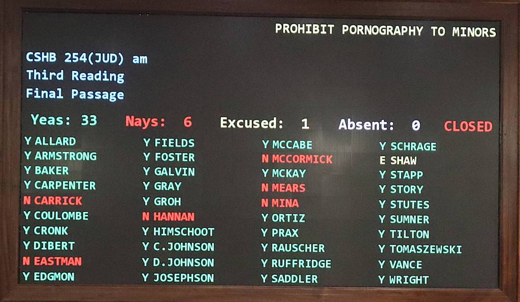 House Bill 254 by Rep. Sarah Vance, a Homer Republican, originally contained only the requirement that people in Alaska verify they are at least 18 years old using a “commercially reasonable age verification method” to access websites where more than one-third of the total content is pornographic material.