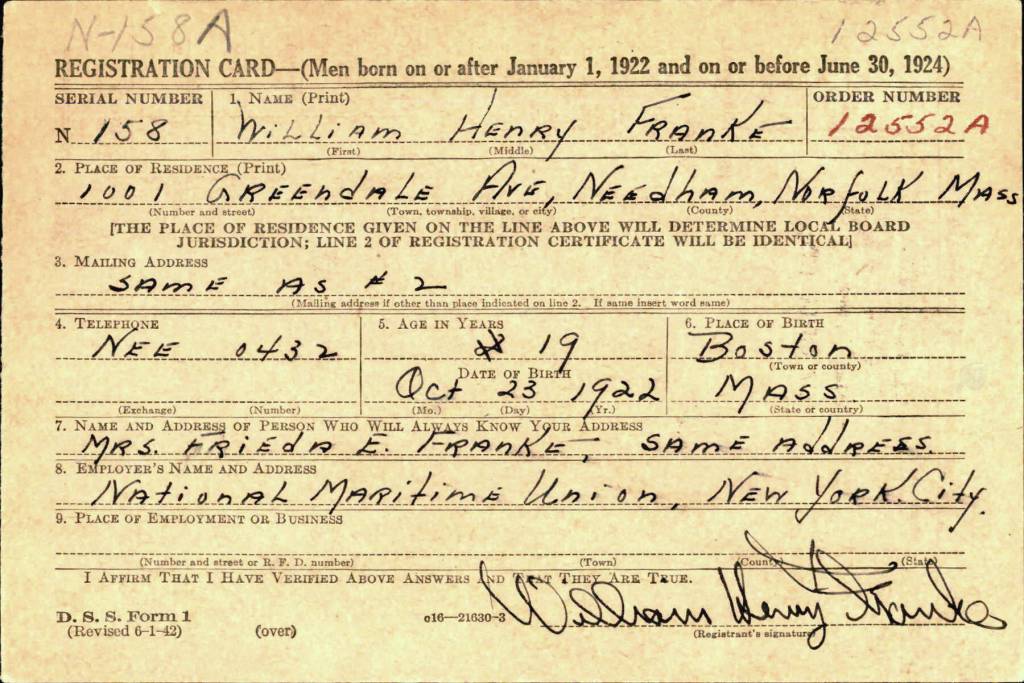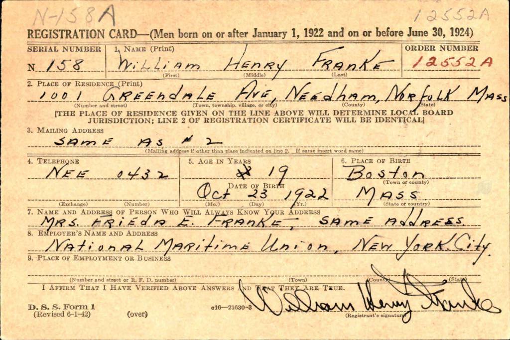 William Henry Franke was born in a Boston suburb on Oct. 23, 1922, to a German immigrant father and a Boston-born mother, William Augustus and Frieda K.E. (Fischer) Franke. By the time he was 19, young William stood 6-foot-1 and weighed 185 pounds, according to his draft-registration card. He was a white man with blue eyes, blond hair and a light complexion. He was frequently described as handsome in news reports.