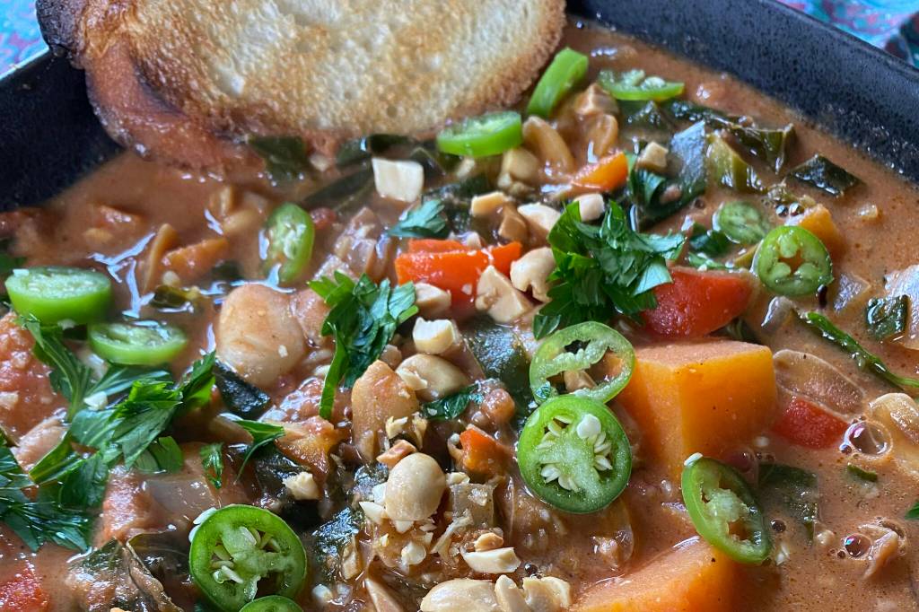 This nutritious and calorie-dense West African Peanut Stew is rich and complex with layers of flavor and depth. (Photo by Tressa Dale/Peninsula Clarion)