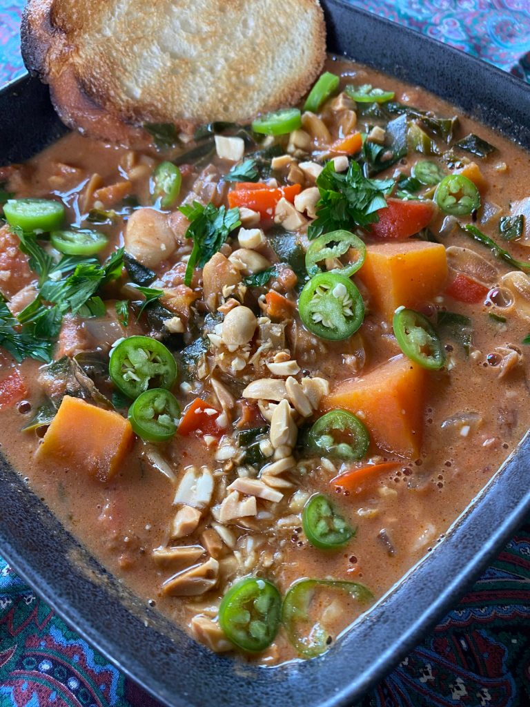 Garnish with fresh parsley or cilantro, extra chopped peanuts, sliced serrano pepper (the fat in the peanut butter tames the spice, so don’t be shy) and serve with steamed rice or toast.
