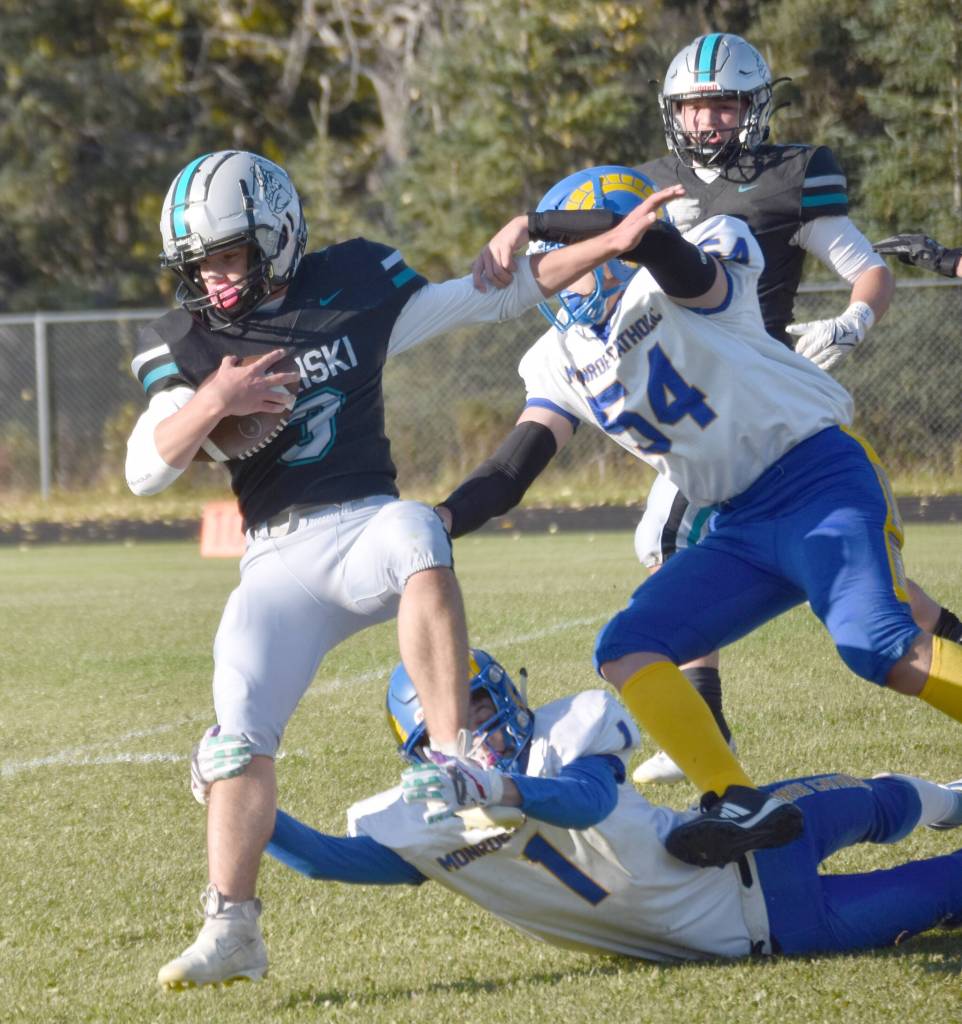 Nikiski’s Kaiden Parrish picks up yardage against Monroe Catholic’s Isaiah Snow and Taylor Pearson on Friday, Sept. 20, 2024, at Nikiski Middle-High School in Nikiski, Alaska. (Photo by Jeff Helminiak/Peninsula Clarion)