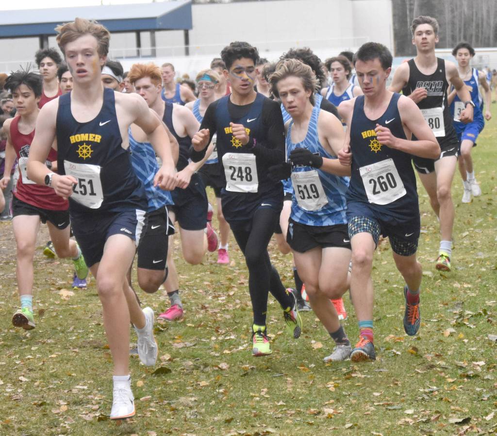Homer’s Caleb Bunker leads the way as Valdez’s Reggie Baksis races between Homer’s Jai Badajos and Reid Rauch in the Division II boys race at the state cross-country running meet on Saturday, Oct. 5, 2024, at Bartlett High School in Anchorage, Alaska. (Photo by Jeff Helminiak/Peninsula Clarion)