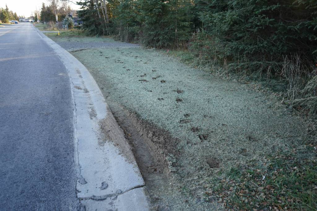 Moose tracks disturb fresh sod along Lilac Lane in Kenai, Alaska, on Friday, Oct. 18, 2024. (Jake Dye/Peninsula Clarion)