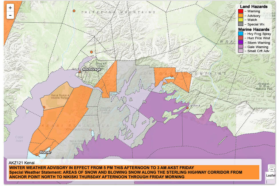 That advisory replaced a special weather statement published for the same area at 5 a.m. that says significant snowfall may also be seen near Anchor Point.