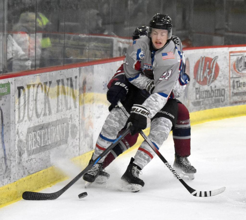 Greye Rampton of the Kenai River Brown Bears battles for the puck Friday, Nov. 15, 2024, at the Soldotna Regional Sports Complex in Soldotna, Alaska. (Photo by Jeff Helminiak/Peninsula Clarion)