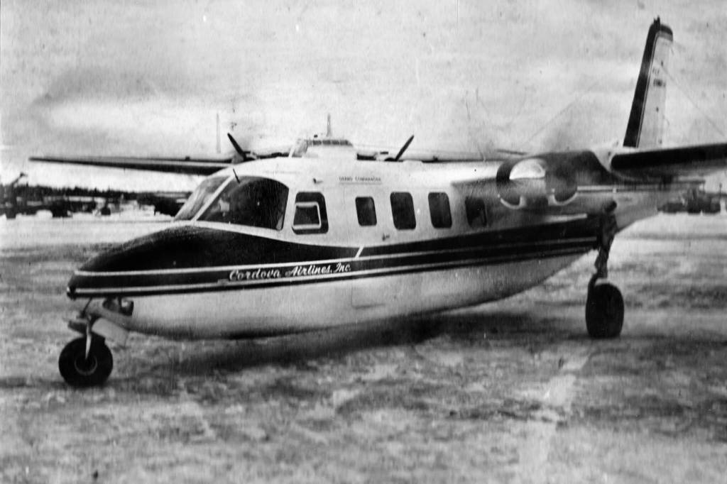 This is the 42-foot Aero Grand Commander, owned by Cordova Airlines, that crashed into Tustumena Lake in 1965. (Photo courtesy of the Galliett Family Collection)
