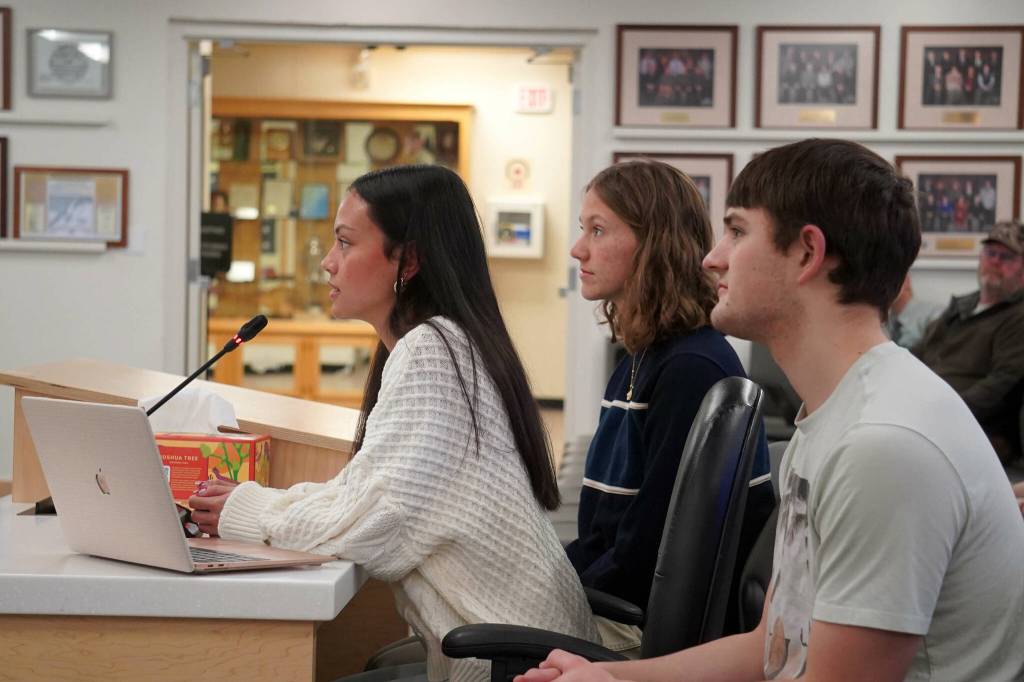 Among the first items on the assembly’s agenda on Tuesday — after approval of the agenda but before a series of reports, public hearings and testimony — was a presentation by the Soldotna High School Student Council. President Emma Glassmaker was flanked by members of the council’s executive board, Cammy Kincaid and Will Klein, in reporting to the council about this year’s first semester at SoHi.