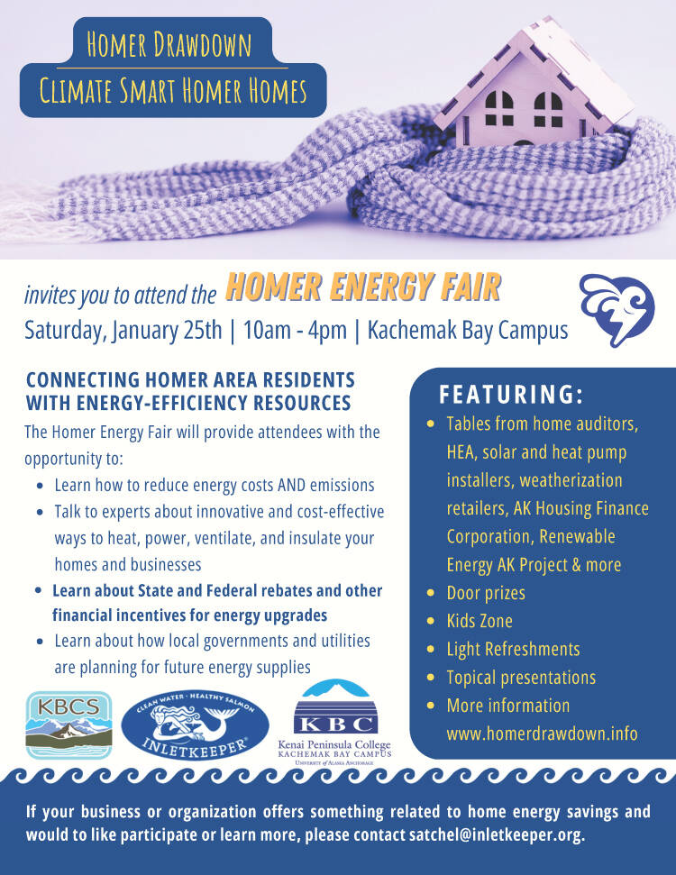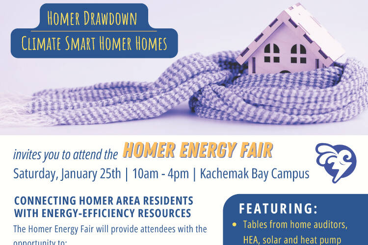 The Homer Drawdown group, a network of concerned community members seeking to mitigate some of the effects of climate change, is sponsoring the Homer Energy Fair. The group’s current project focuses on energy-smart homes for a changing climate. Improving residential energy efficiency, providing residential renewable energy opportunities, and assisting the public with signing up for the Alaska Weatherization Assistance Program are parts of the project.
