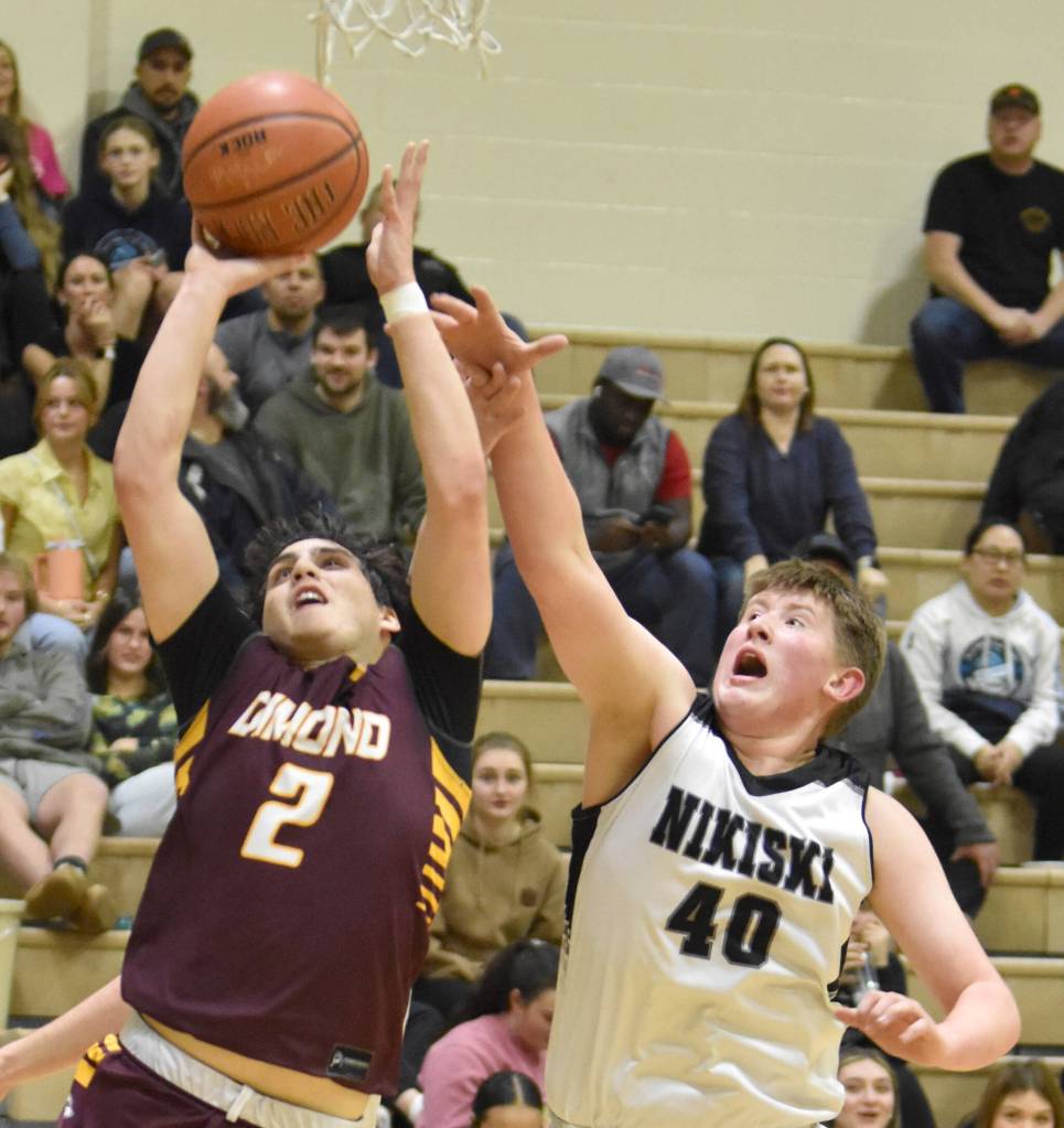 Dimond’s Jace Christophersen drives on Nikiski’s Kameron Bird at the 36th Annual Rus Hitchcock Nikiski Tip Off Tournament on Thursday, Jan. 16, 2025, at Nikiski Middle-High School in Nikiski, Alaska. (Photo by Jeff Helminiak/Peninsula Clarion)