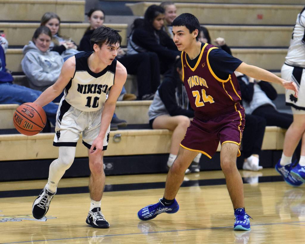 Nikiski’s Carter Eiter dribbles against Dimond JV’s Javier Meraz at the 36th Annual Rus Hitchcock Nikiski Tip Off Tournament on Thursday, Jan. 16, 2025, at Nikiski Middle-High School in Nikiski, Alaska. (Photo by Jeff Helminiak/Peninsula Clarion)