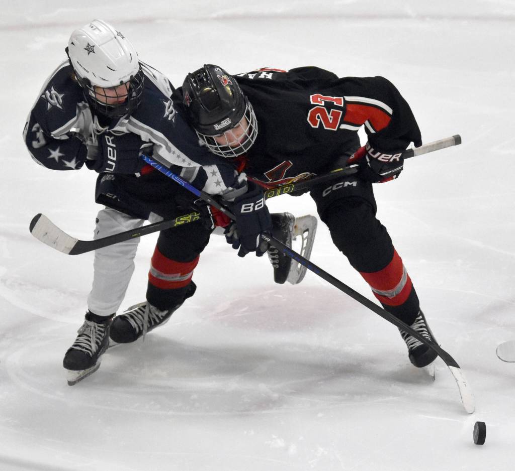 Soldotna’s Draiden Mullican and Kenai Central’s Noah Hallam battle for the puck Thursday, Jan. 30, 2025, at the Soldotna Regional Sports Complex in Soldotna, Alaska. (Photo by Jeff Helminiak/Peninsula Clarion)