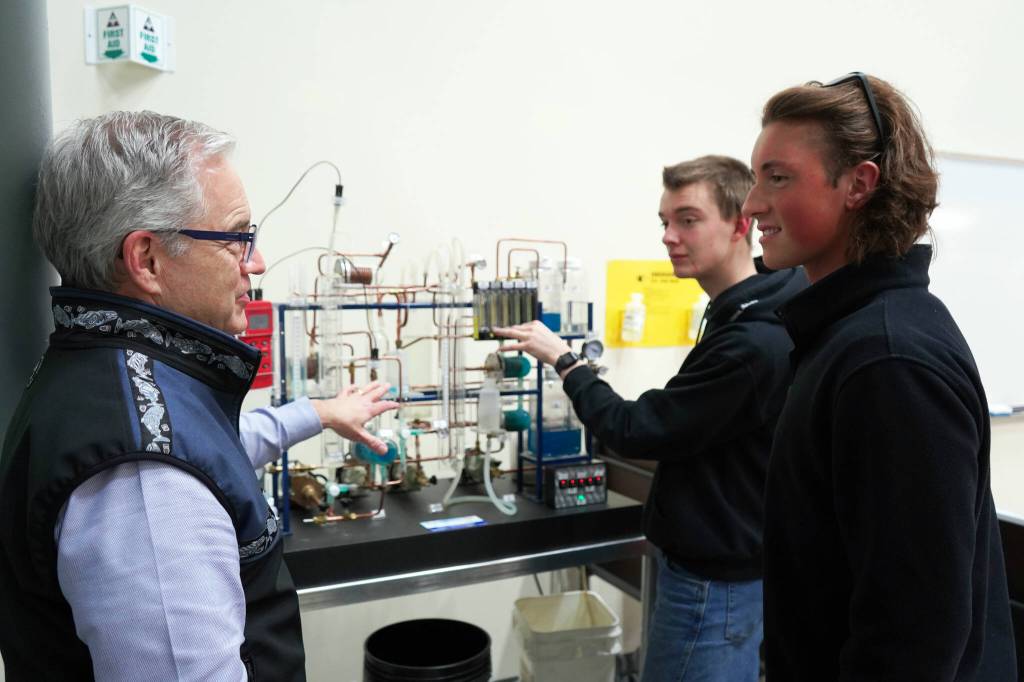 University of Alaska Anchorage Chancellor Sean Parnell asks Bryce Hopkins about a distillation model at a showcase of Kenai Peninsula College’s career and technical education programs in the college’s Career and Technical Center in Soldotna, Alaska, on Thursday, Feb. 20, 2025. (Jake Dye/Peninsula Clarion)
