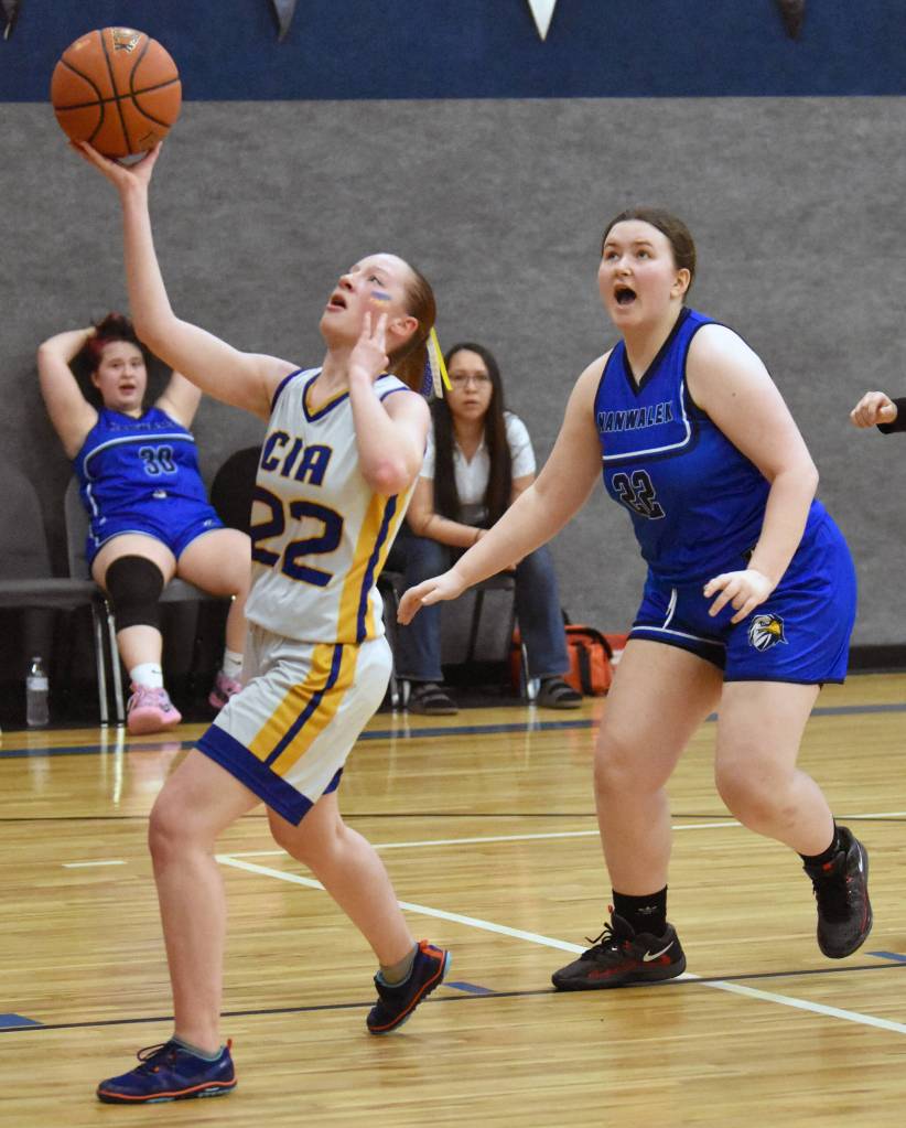 Cook Inlet Academy’s Beka Dillingham drives on Nanwalek’s Hadassah Haskins on Saturday, March 1, 2025, at the Peninsula Conference tournament at Cook Inlet Academy just outside of Soldotna, Alaska. (Photo by Jeff Helminiak/Peninsula Clarion)