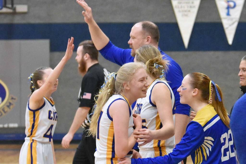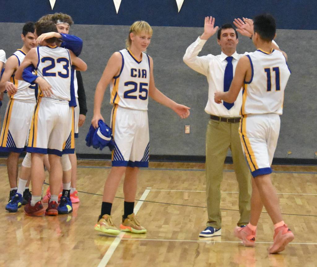 Cook Inlet Academy head coach Josh Hawley celebrates with his team Saturday, March 1, 2025, at the Peninsula Conference tournament at Cook Inlet Academy just outside of Soldotna, Alaska. (Photo by Jeff Helminiak/Peninsula Clarion)