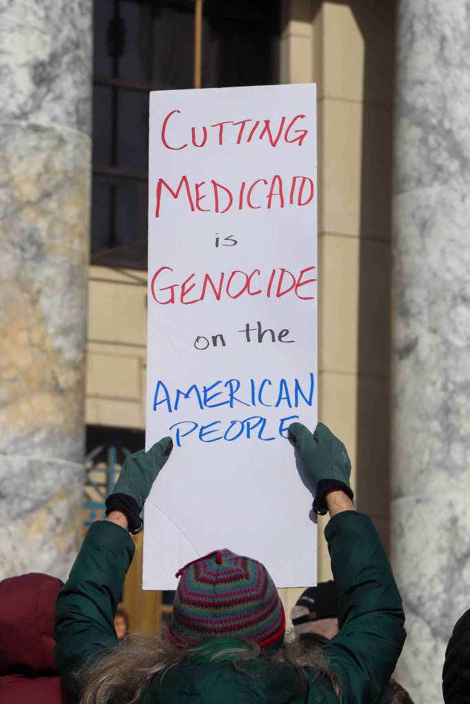 About 60 people rallied in Juneau on Wednesday afternoon, carrying the voices of thousands of Alaskans who are at risk of losing their health care under a federal budget plan being advanced by Republicans in Washington, D.C.