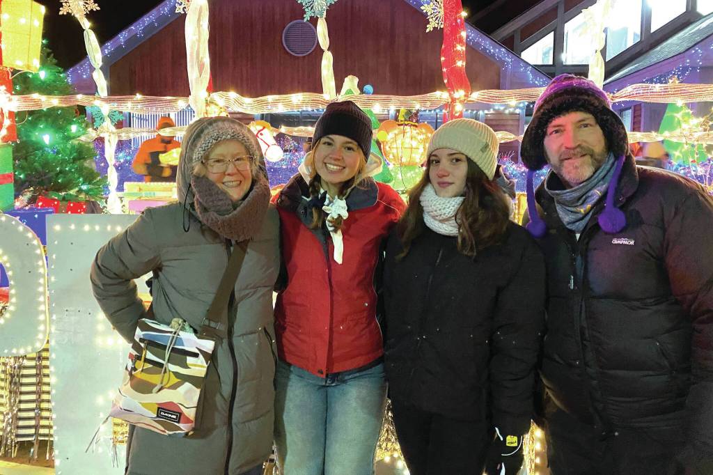 Cemre Akgul of Turkey, center left, and Flokarta Hoxha of Kosovo, center right, stand for a photo with members of their host family, Casady and Patrick Herding, at the Kenai Chamber of Commerce and Visitor’s Center in Kenai, Alaska, on Friday, Nov. 29, 2024. (Photo provided by Patrick Herding)