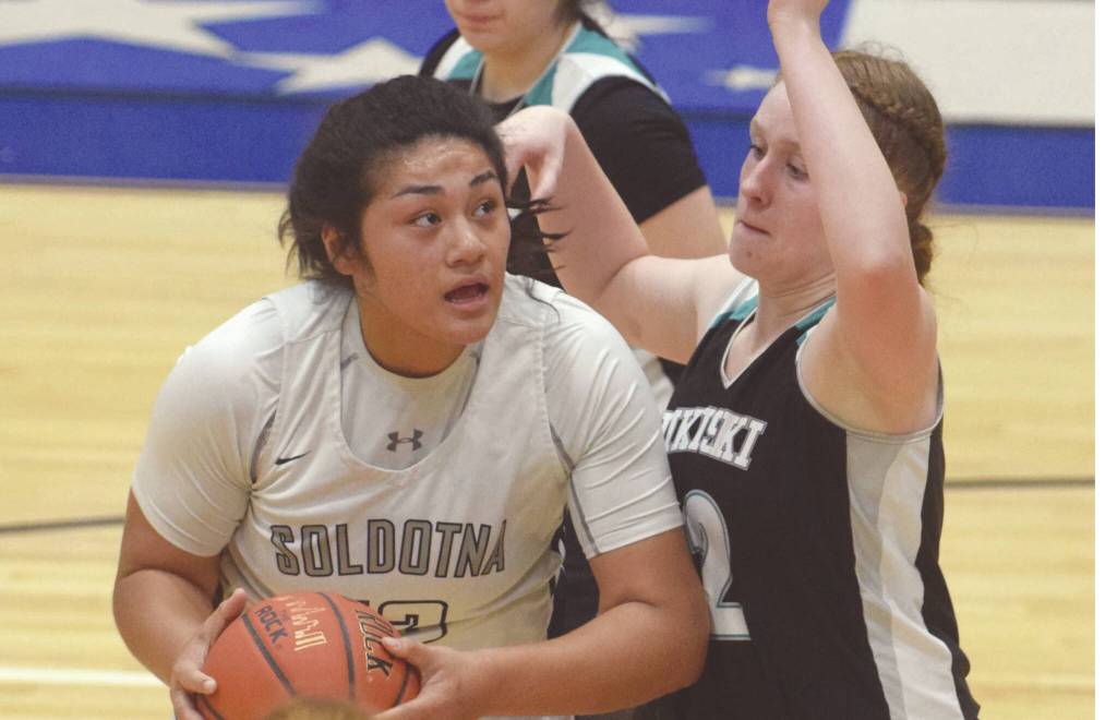 Soldotna's Ituau Tuisaula powers up against Nikiski's Kaycee Bostic on Tuesday, Jan. 21, 2020, at Soldotna High School in Soldotna, Alaska. (Photo by Jeff Helminiak/Peninsula Clarion)
