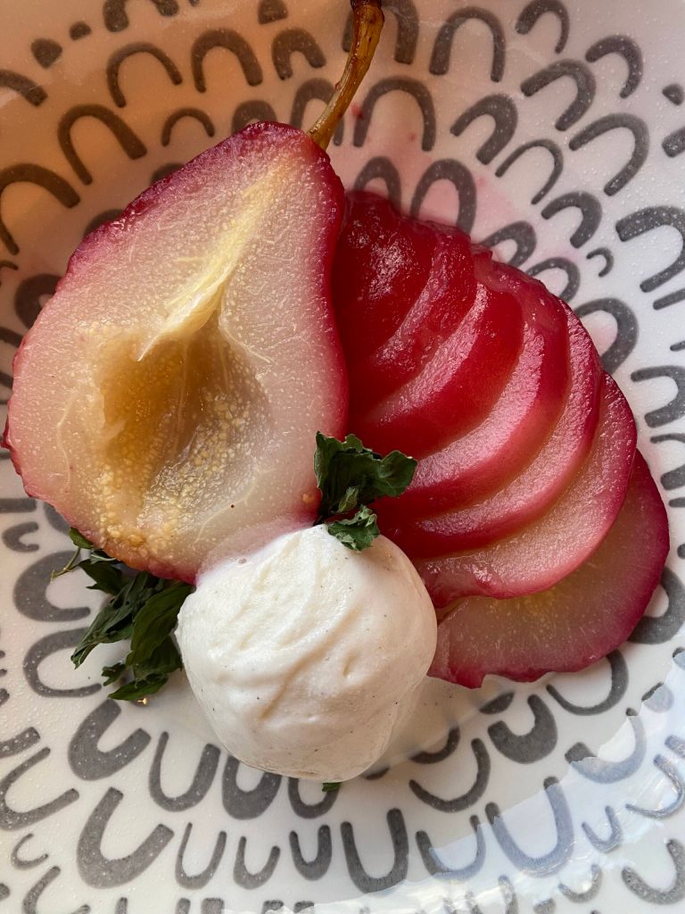 My nephew would certainly snub this dessert (I would prepare ice cream for him instead) but my niece would enjoy the soft and grainy texture and the crimson ombre stain on these poached pears.