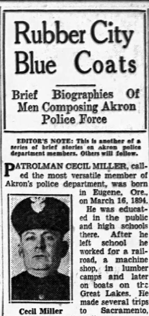When Cecil Miller was a patrolman for the Akron (Ohio) Police Department, he was featured in a brief bio in a 1928 edition of the Akron Beacon Journal.