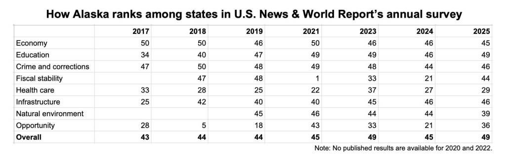 A chart shows Alaska’s rankings in U.S. News & World Report’s annual survey between 2017 and 2025.