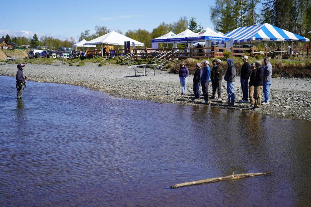 Alongside the water — and sometimes in it — a variety of groups and people offered demonstrations and tips to prepare for summertime fishing. Local fishing guide Greg Springer taught a group techniques to safely and effectively fish for sockeye from a crowded riverbank; “Kenai River Trout Hunter” Hunter Heafer showcased spey casting to another group.