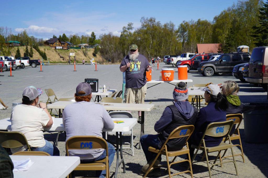 Greg Springer delivers a presentation on sockeye fishing during A Day at the River at Centennial Park in Soldotna, Alaska, on Saturday, May 10, 2025. (Jake Dye/Peninsula Clarion)