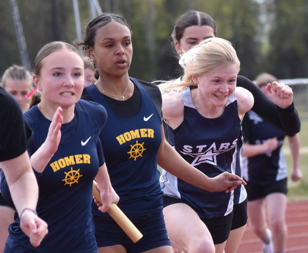 800 relay — 1. Homer (Harris, Clarke, Bates, Evans), 1:54.07; 2. Soldotna, 1:54.16; 3. Nikiski, 2:12.87; 4. Soldotna, 2:13.75; 5. Soldotna, 2:23.90.