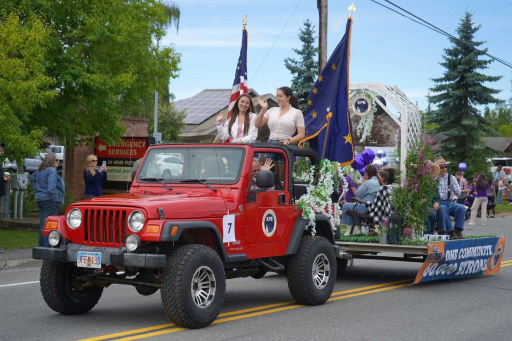 This year, the parade theme was “Homegrown Happiness.” The Soldotna Rodeo, the Kenai Peninsula Racing Lions, Century 21 Realty, Heritage Place, Aspen Creek Senior Living, the Soldotna Public Library, Central Emergency Services and more were represented. The parade also featured the first Kenai Peninsula campaign appearance of a 2026 Alaska gubernatorial candidate, as Matt Heilala, R-Anchorage, shook hands and threw candy — introducing himself first as a 1988 Soldotna High School graduate.
