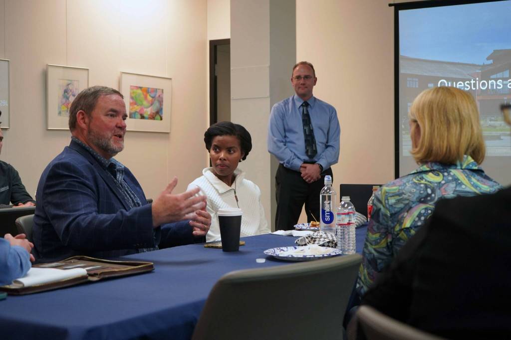 Kenai Peninsula Borough School District Superintendent Clayton Holland speaks during a presentation on E-Rate to Federal Communications Commission Commissioner Olivia Trusty and U.S. Sen. Lisa Murkowski in the KPBSD offices in Soldotna, Alaska, on Wednesday, Aug. 20, 2025. (Jake Dye/Peninsula Clarion)