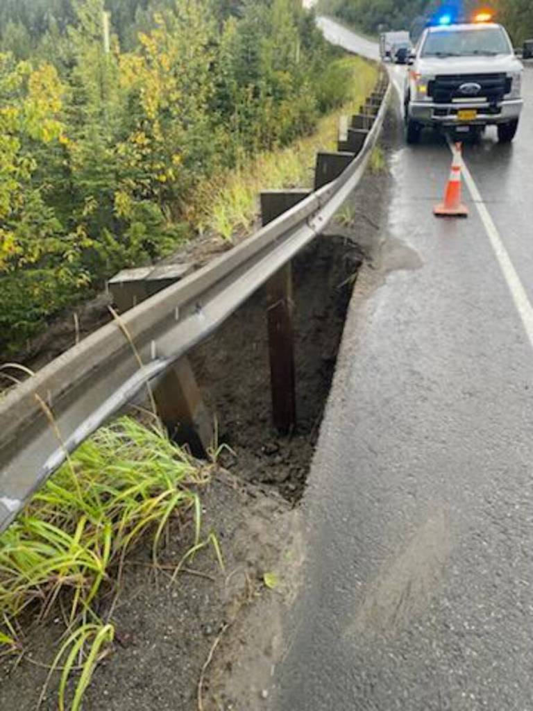 The Alaska Department of Transportation announced Thursday morning on Facebook that the washout has begun to undercut the roadway. Photos show the washed-out area marked by cones. Drivers are advised to slow down and use caution in that area.