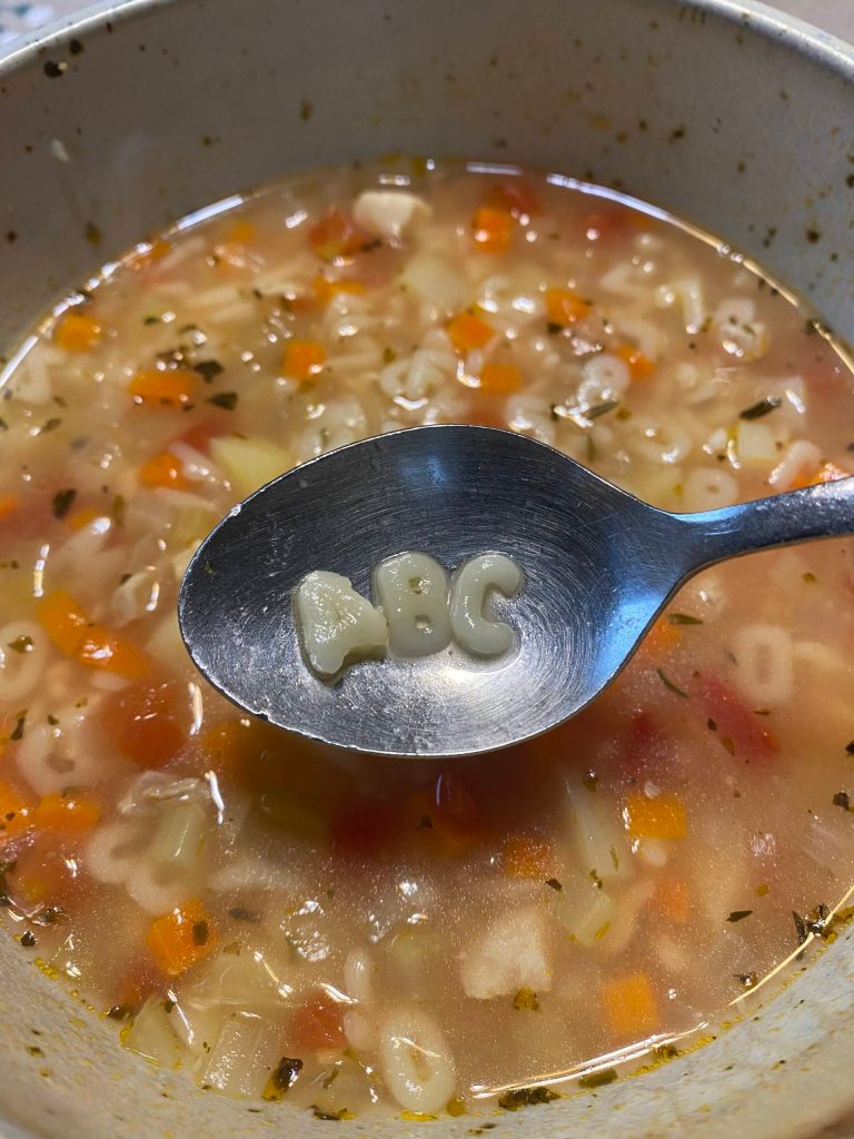 We had a great time at dinner picking letters out of our alphabet soup and thinking of words that start with them, and I hope he continues the game with his friends when he gets the leftovers in his lunch. The key to this soup is knife work — the chicken and vegetables need to be uniformly cut into a ¼ inch dice, and you get extra credit for homemade chicken bone broth. You can use chicken breast if you wish, but I find that breast dries out when cut in such tiny pieces, so thigh is better. Vegan option: Add 1 pound mushroom — ¼ inch dice — and substitute vegetable stock.