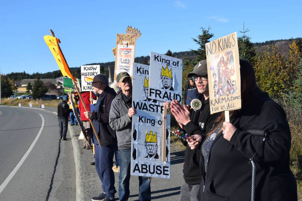 The sun shone bright in a clear blue sky over more than 700 Kenai Peninsula residents gathered Saturday afternoon at the intersection of Sterling Highway and Lake Street in Homer for the second “No Kings” protest to occur this year.