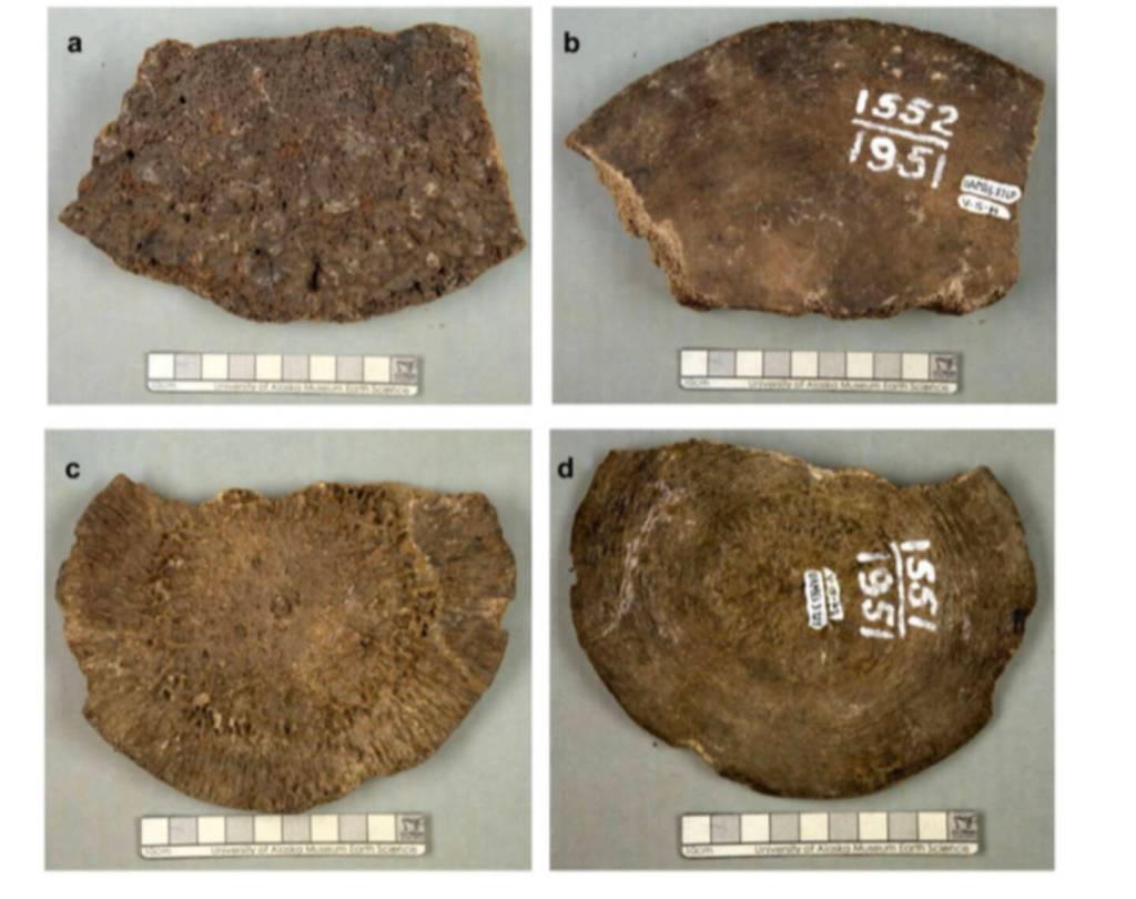 Explorer and naturalist Otto Geist enriched the university museum with thousands of bones from the 1920s to the 1960s. He collected the fossils in question. The discs still bear his white paint script with the year, 1951, and sample number.