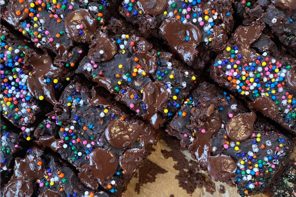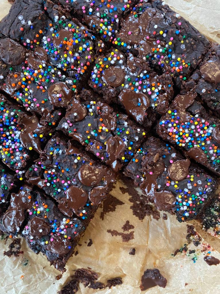 When I was his age, popular kids came to school with packaged cakes in their lunches. They would raise them high and announce their treat of the day and trade for their favorites. The most coveted by far was the cosmic brownie covered in fudge and sprinkles, which was basically currency in the cafeteria when I was young, and the lucky kids who found them in their lunchboxes would proclaim their mom to be the best in the world. I won’t be buying those for him anytime soon, but he will find a square of my fudgy black bean cosmic brownies in his lunch this week. These treats are full of fiber and protein and contain less sugar than a nutri-grain bar, so I can feel good about spoiling him a little. When I handed him one to try, he asked, “This is just a normal brownie, right?” and I had to laugh because it’s clear that my little guy is catching on to my sneaky ways. “It’s a brownie,” I said, “with sprinkles on top,” and I agreed to give him another when he quickly finished his first square … but I had to say no when he asked for a third.
