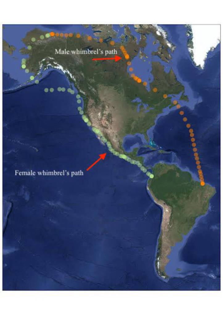 This graphic shows the divergent migration paths of a mated pair of whimbrels, shorebirds that migrate from South America to Alaska and back. Illustration courtesy Dan Ruthrauff