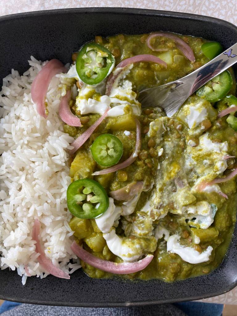 Tressa Dale/Peninsula Clarion Potato and pea lentil curry is perfect served with steamed rice and garnished with Greek yogurt, pickled red onions, and fresh jalapeno.
