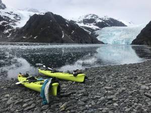 A pair of sea kayaks prepare to play the waters of Kenai Fjords National Park earlier this summer. (Photo by Kat Sorensen)