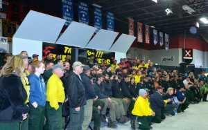 Photo by Dan Balmer/Peninsula Clarion Firefighters involved in containing the Funny River Horse Trail wildfire gather for a photo at the appreciation dinner Sunday at the Soldotna Regional Sports Complex. More than 700 firefighters from Alaska, Canada, Oregon and Montana have battled the blaze since it began on May 19.