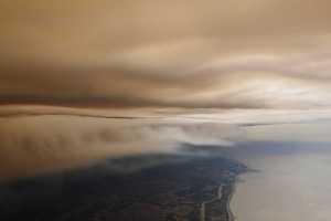 Photo by Rashah McChesney/Peninsula Clarion  A cloud of smoke obscures the sky on the east side of the Kenai Peninsula as a fire that started near Funny River Road consumed more than 7,000 acres of Kenai National Wildlife Refuge land Tuesday May 20, 2014. The fire stretches nearly 10 miles long and is moving east and west along the bank of Tustumena Lake.
