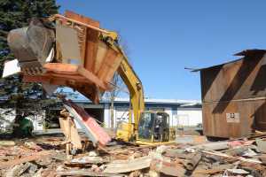 Dust permeated the air as an excavator crunched down on a building sectioned off by yellow “Do Not…