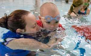 Photo by Rashah McChesney/Peninsula Clarion Kim McMilin coaxes Andrew Thompson, 5, into putting his face into the water and blowing bubbles Tuesday Feb. 5, 2013 at the Skyview High School pool in Soldotna, Alaska. Thompson and about 20 other children were in the water during the February session of their Swim America swimming lessons.