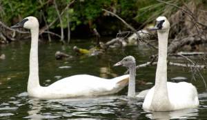 A family of tundra swans swim near the banks of Spruce Lake, part of the Swan Lake canoe…