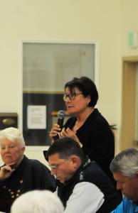 An attendee at the Central Kenai Peninsula League of Women Voters’ forum asks a question to the panel of candidates for Kenai Peninsula Borough Assembly and borough mayor Wednesday, Sept. 13, 2017 in Soldotna, Alaska. (Photo by Elizabeth Earl/Peninsula Clarion)