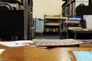 Supplies sit on the desk in the newly finished book sale room in the basement of the Soldotna Public Library on Wednesday, July 12, 2017 in Soldotna, Alaska. (Photo by Elizabeth Earl/Peninsula Clarion)