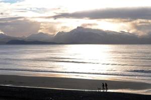 Two people walk their dog across Bishop’s Beach on Saturday, Dec. 3, 2016 in Homer, Alaska. (Photo by Elizabeth Earl/Peninsula Clarion, file)