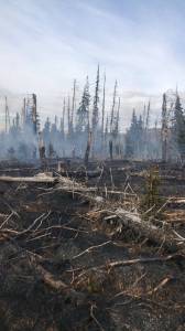 Burned trees are shown at the scene of a wildfire in Nikolaevsk, near Ninilchik, on May 15. Killed by invasive beetles, the heavy trees provide potent fuel for wildfires and provide challenges for fire crews. (Photo courtesy of the Alaska Division of Forestry)