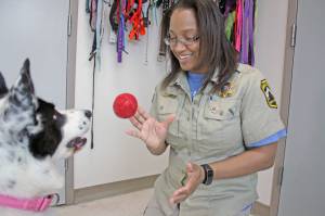 Jessica Hendrickson, chief animal control officer at the Kenai Animal Shelter, tosses a ball to Cherokee, one of the shelter’s adoptable dogs on Thursday, May 17. President of the Alaska Animal Control Association, Hendrickson helped organize a training conference sponsored by the nonprofit, which has been inactive for at least seven years. (Photo by Erin Thompson/Peninsula Clarion)