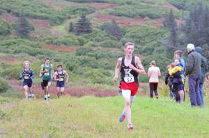 Kenai Central High School runner Maison Dunham pulls ahead of the pack nearing the end of the varisy boys race at the Kenai Peninsula Borough Cross-Country Running Championships on Tuesday, Sept. 12, 2017 at the Lookout Mountain Trails near Homer, Alaska. Soldotna High School took first overall out of the varsity boys teams, and the Kenai team claimed the top spot for the girls. (Photo by Megan Pacer/Homer News)